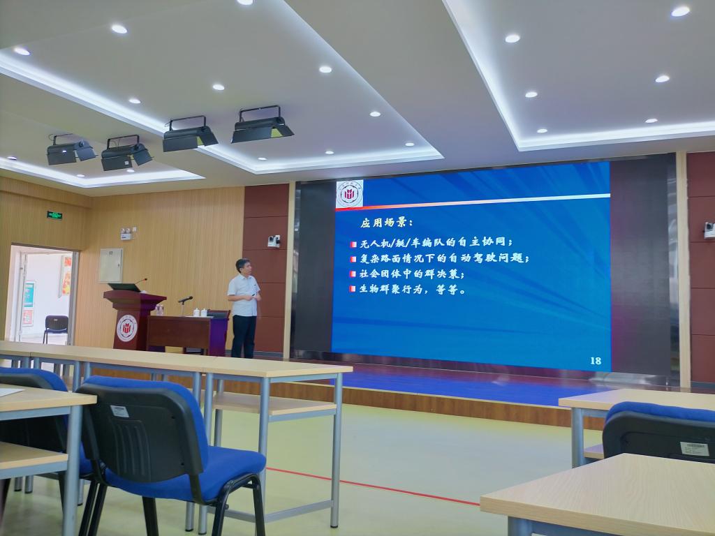 运筹学与控制理论团队的吴晓峰教授主要介绍复杂系统建模与控制方向,专业主要涉及的领域是混沌系统与控制、群体智能与复杂网络以及数据分析与信息融合。吴晓峰教授对以上三个领域应用分别进行了介绍,有该方向在草原生态中的应用、无人机的自主协同、社会团体中的群决策和生物群聚行为等等。最后他向研究生们介绍了基于代谢组学的腰椎间盘退变计算机辅助诊断研究,让研究生们更好理解该方向在生活中的应用。
