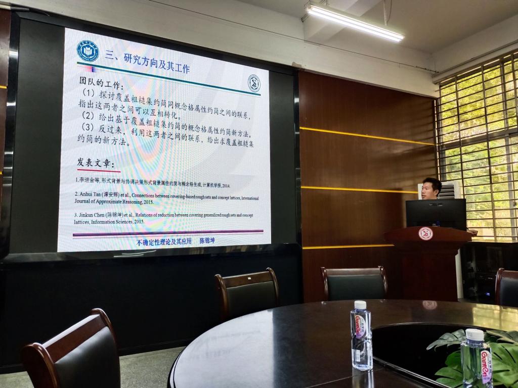9月16日上午,陈锦坤副教授在砺志楼114会议室介绍了不确定性理论及其应用团队。他首先讲述了团队建设的基本情况,从2004年开始,学院以讨论班的形式展开学术讨论,已历经16年。接着他介绍了研究方向及其工作的主要领域涉及粗糙集基础理论工作(公理化)中的覆盖近似算子和公理化问题、覆盖粗糙集约简与概念格属性约简、多粒度信息融合以及与其它领域的交叉研究等。最后他向研究生们介绍了学习该方向的所需要的基础知识。