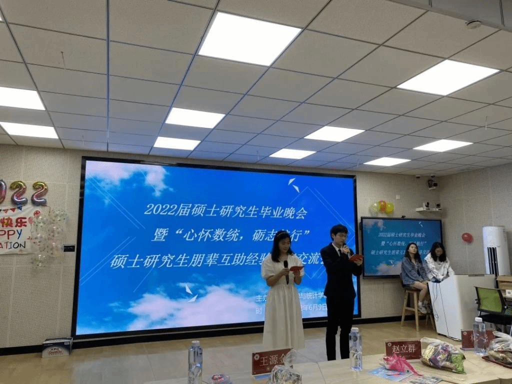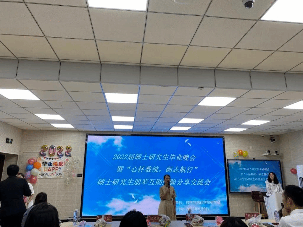 于砺志楼131举办了2022届硕士研究生毕业晚会暨“心怀数统,砺志航行”硕士研究生朋辈互助经验分享交流会,学院党委副书记林晓老师,团委书记罗晓林老师,辅导员郑珊老师与毕业生们欢聚一堂,共同奏响毕业的骊歌。