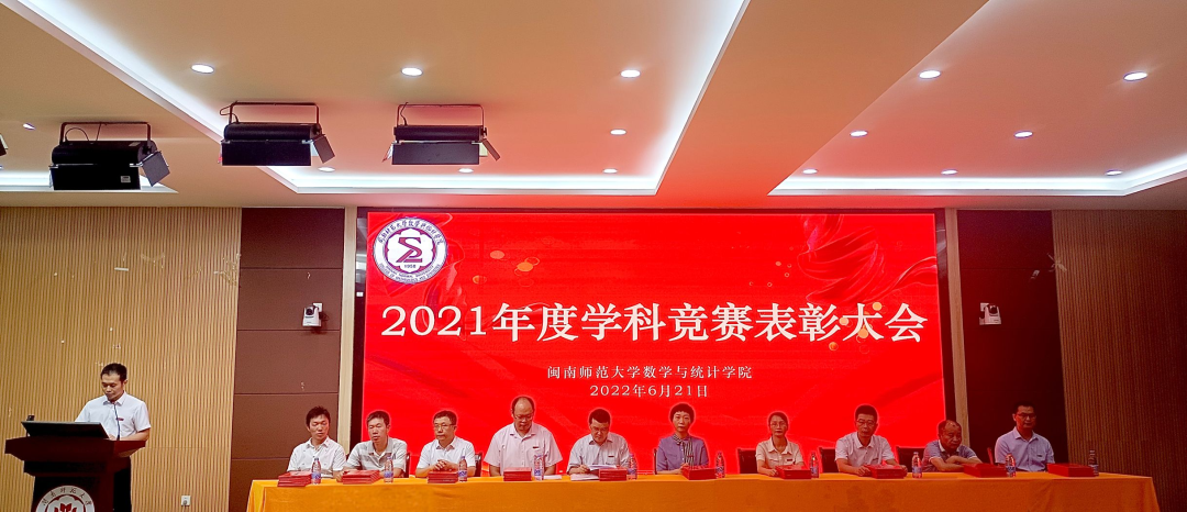 在砺志楼120教室举办“2021年度学科竞赛表彰大会”。院长徐晓泉、党委书记陈晶莹、常务副院长黄韩亮、副书记林晓、副院长胡海智、副院长施建华、院长助理陈锦坤、数学系主任周仕荣、大学数学教学部主任袁正中、统计系主任李气芳以及指导老师代表、各年级辅导员、受表彰的获奖代表和各班级代表出席大会。会议由团委书记罗晓林老师主持。