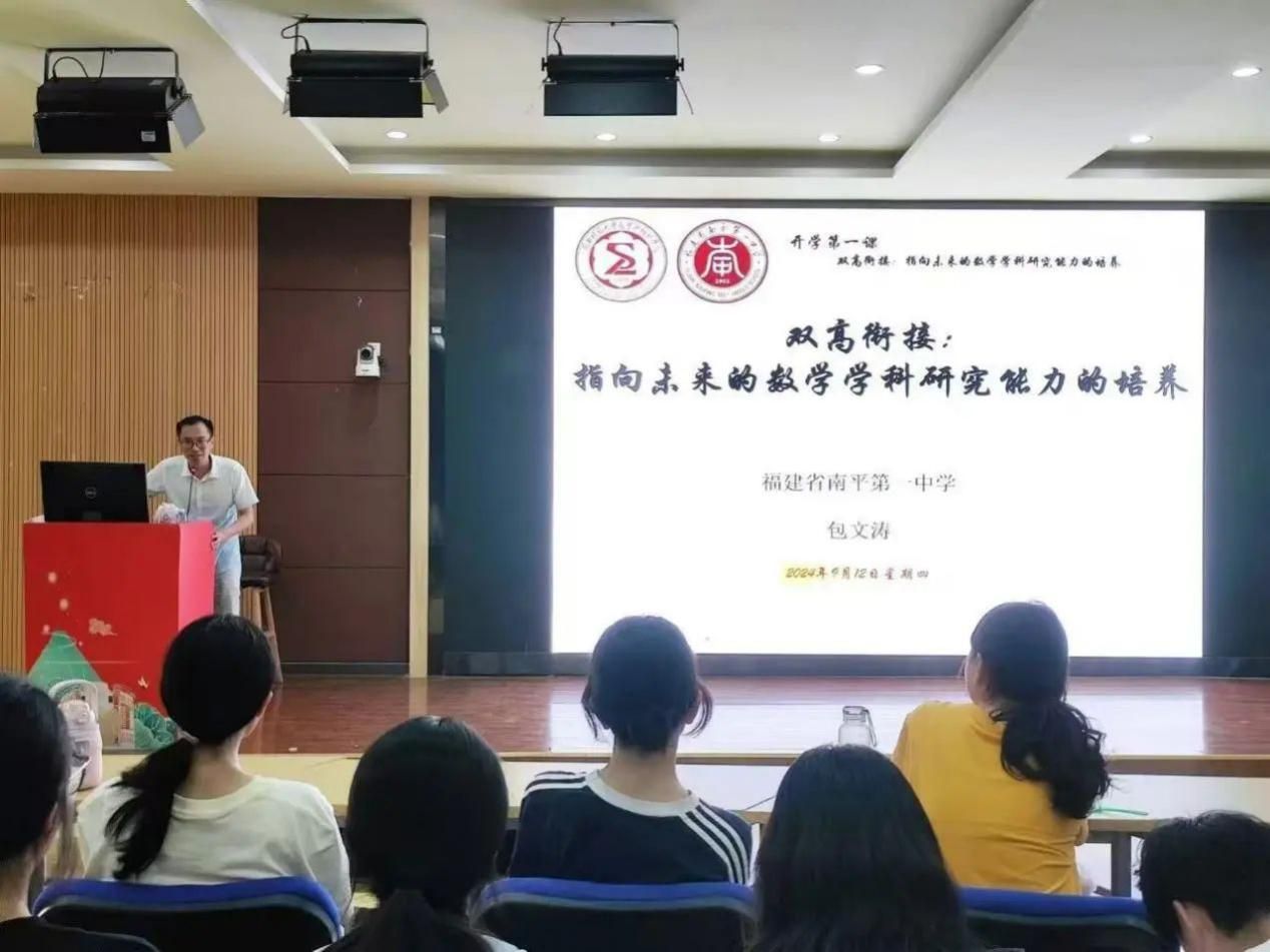 邀请优秀校友、南平一中数学教师包文涛老师为2024级全体新生带来了《双高衔接:指向未来的数学学科研究能力的培养》的专题讲座。包文涛老师分享了从“高中”到“高校”的数学创新思维能力的培养的双高衔接,助力新生拓展数学思维能力。