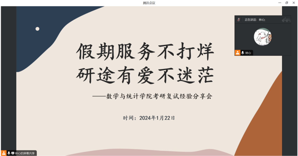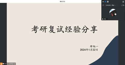 于1月22日晚通过线上腾讯会议开展“假期服务不打烊,研途有爱不迷茫”考研复试经验分享会。缪旭一、叶洙溶、刘熙、王淑娜四位2023届优秀校友受邀分享考研复试经验,20级辅导员黄艺佳及ace动漫