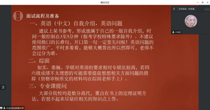 刘熙从成绩查询、复试流程和具体准备三个方面来介绍,他向大家分享了个人的复试经历,干货满满,建议考生在寒假期间夯实专业基础,巧妙运用现有的学科知识破解难题、偏题。