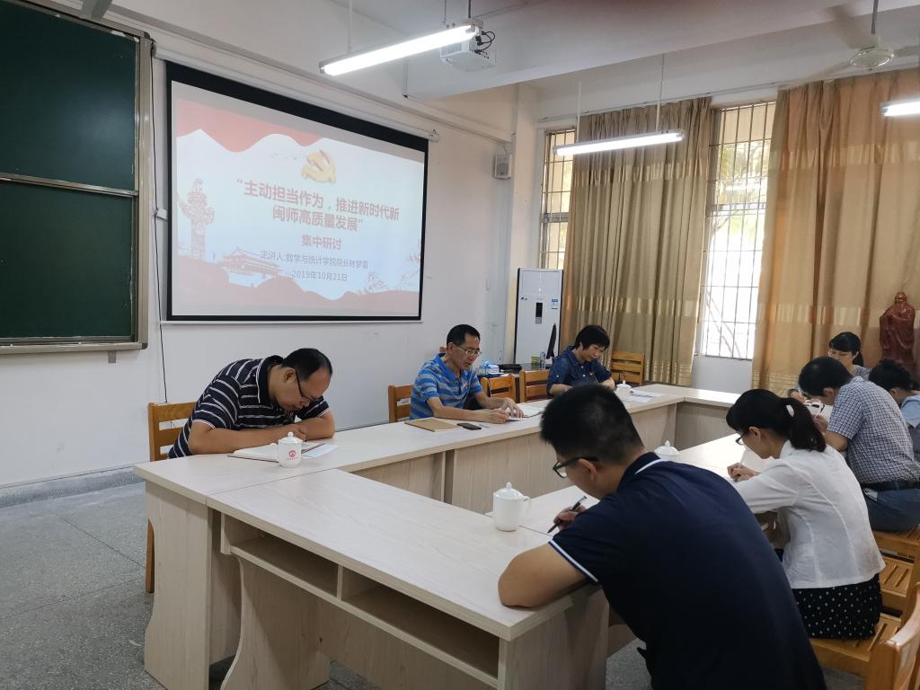 在砺志楼105教室开展“主动担当作为,推进新时代闽师高质量发展”主题研讨会。学院全体党委委员、纪检委员、各支部书记参加研讨会。院长林梦雷作重点发言,会议由党委书记陈晶莹主持。